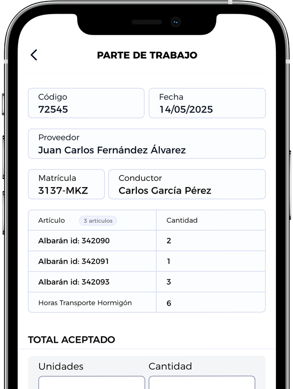 Con la aplicación móvil, tus operarios pueden generar partes de trabajo desde el mismo lugar donde realizan la tarea. Añade materiales, horas empleadas y observaciones en segundos, evitando duplicidades y errores de transcripción. Toda la información queda registrada y sincronizada automáticamente con la plataforma, lista para consultar o facturar.